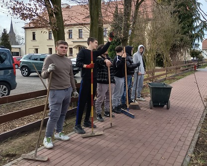 Z tej okazji chłopcy z klasy IVB oraz IIIA nie poszli na wagary ale zrobili wiosenne porządki w ogrodzie szkolnym: grabili liście , obcinali trawy , odkrywali krzewy po zimie oraz pięknie posprzątali teren przed szkołą.